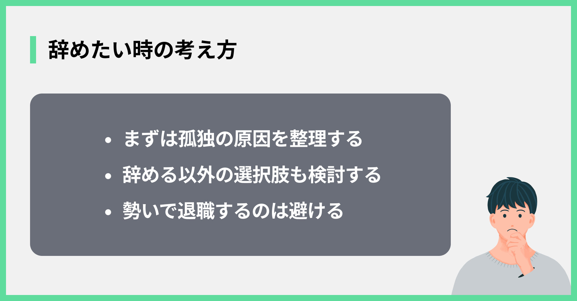 様々なデメリットが積み重なった結果、最終的に早期離職という選択に至ってしまうケースも少なくありません。仕事のパフォーマンスが上がらず、心身の調子も悪い、成長も感じられない、という状況では、「もうこの会社で働き続けるのは無理だ」と感じてしまうのも無理はないでしょう。ですが、十分な準備や計画なしに勢いで辞めてしまうと、次の仕事がなかなか見つからなかったり、同じような悩みを繰り返してしまったりする可能性があります。孤独感を放置することは、自身のキャリアプランに大きな影響を与えかねないのです。