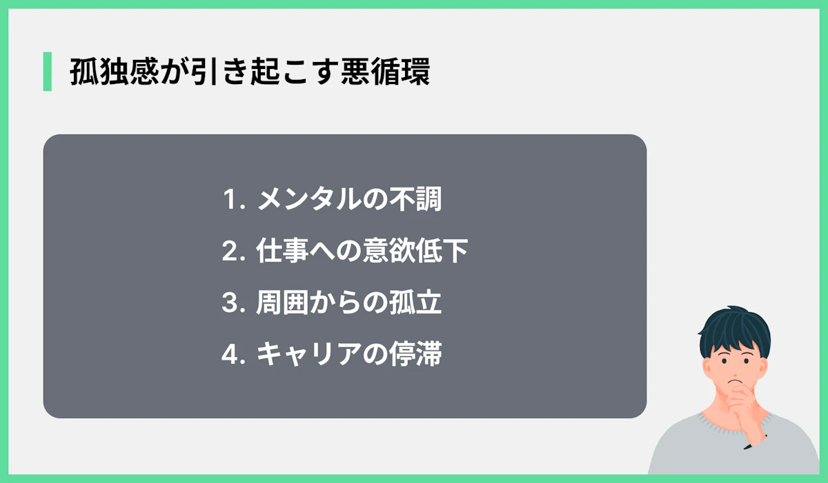 孤独を放置してしまうと、仕事への集中力や意欲が低下する可能性があります。寂しさや不安といったネガティブな感情は、知らず知らずのうちにエネルギーを消耗させます。その結果、仕事中にぼーっとしてしまったり、簡単なミスを繰り返したりと、本来の力を発揮できなくなることがあるのです。また、相談相手がいないことで、仕事上の問題を一人で抱え込み、解決できずにいると、業務の遅延にもつながりかねません。パフォーマンスの低下は、職場での評価にも影響し、さらに自信を失ってしまうという悪循環に陥る危険性があります。