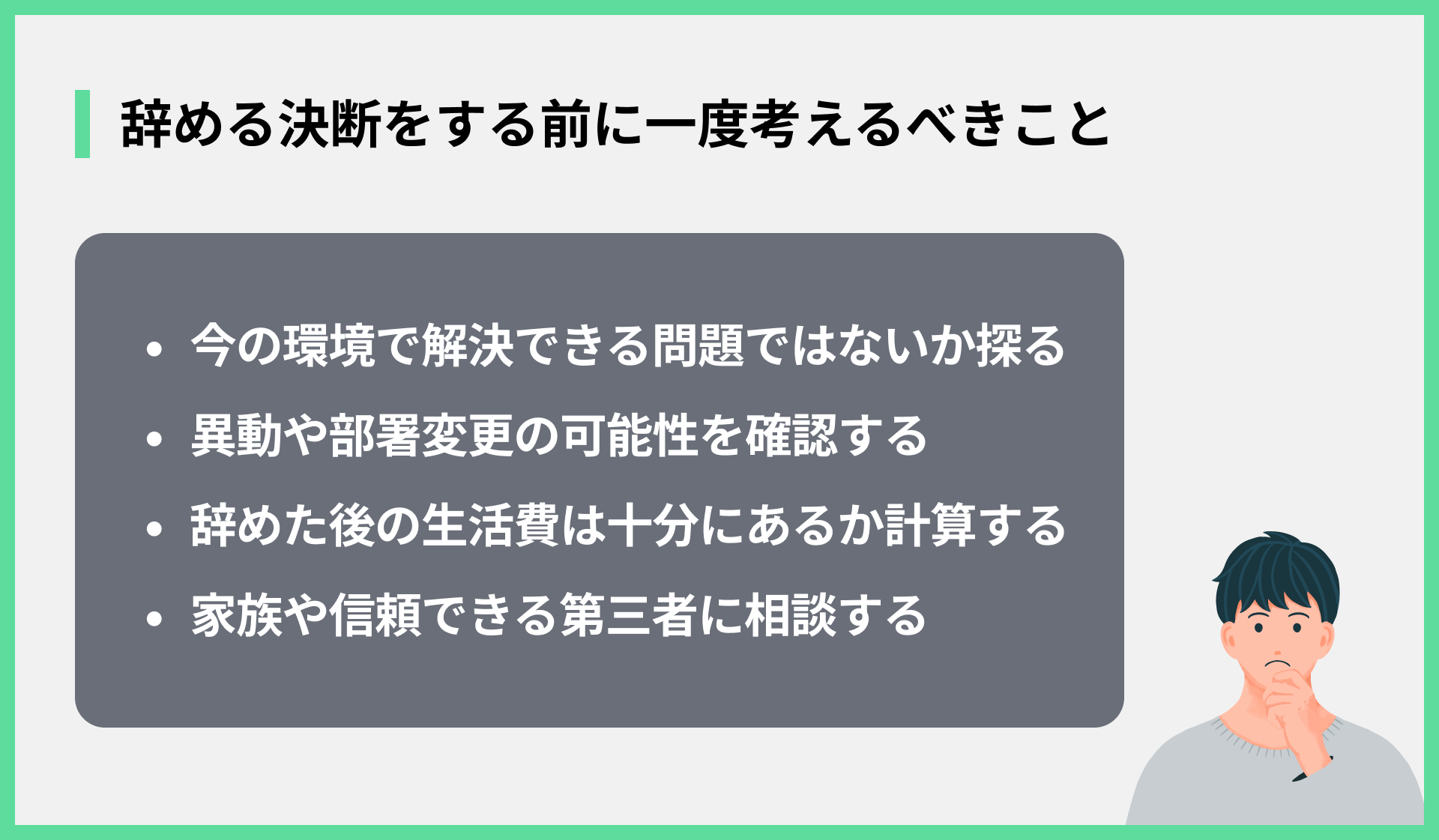 - まずは辞めたい理由を整理することが大切