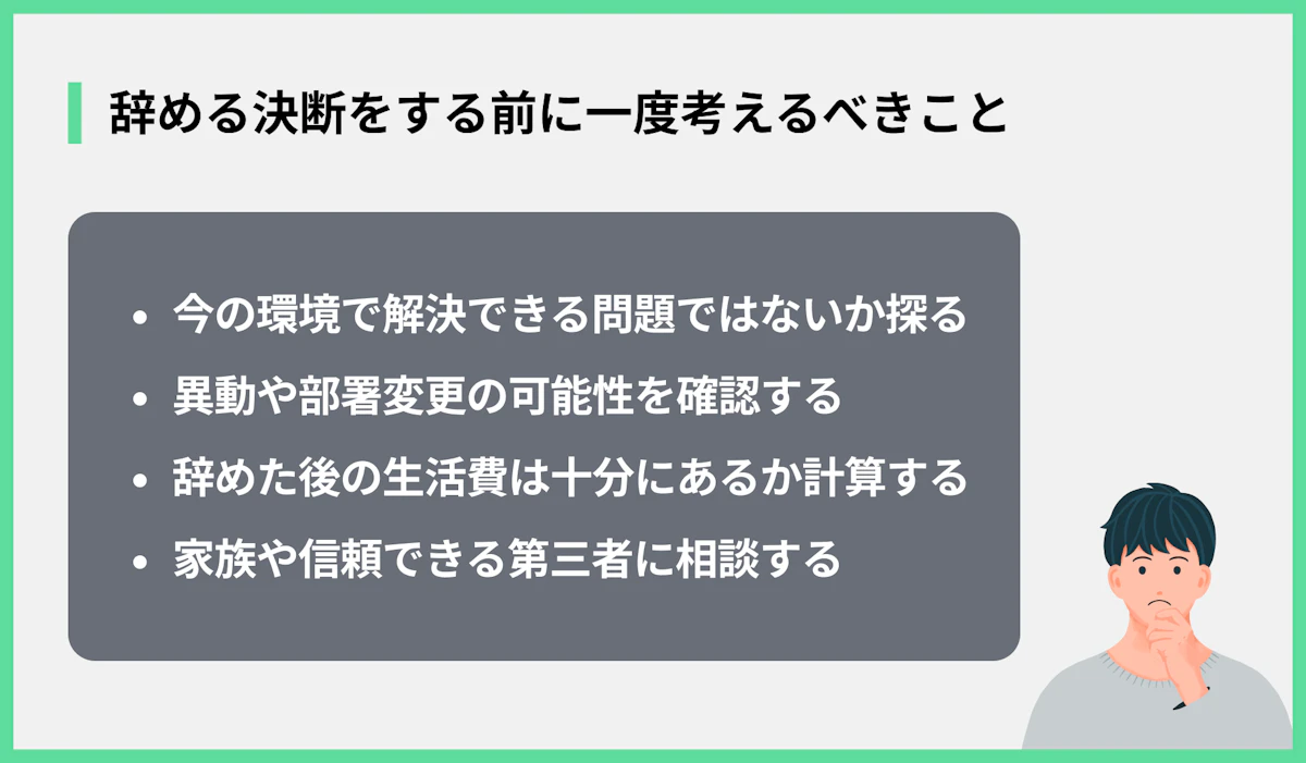 メリットとデメリットを理解した上で、それでも「辞めたい」という気持ちが強いなら、最終決断の前にいくつか確認しておきたいことがあります。具体的には以下の通りです。