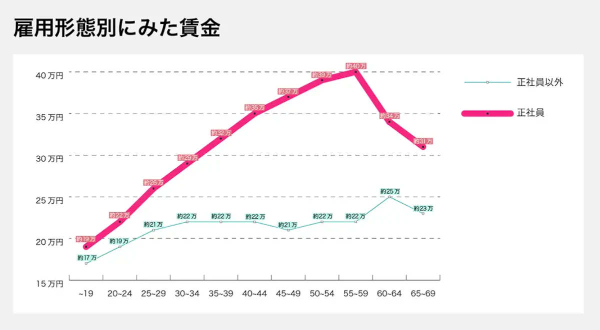 正社員の方が、賃金や福利厚生が充実していることが多いです。以下のグラフを見てもわかるように、正社員と正社員以外を比べると、年齢が上がれば上がるほど差が開いていきます。将来のことを考えると、正社員の方が安心です。安定した生活を求める方は、正社員を目指しましょう。