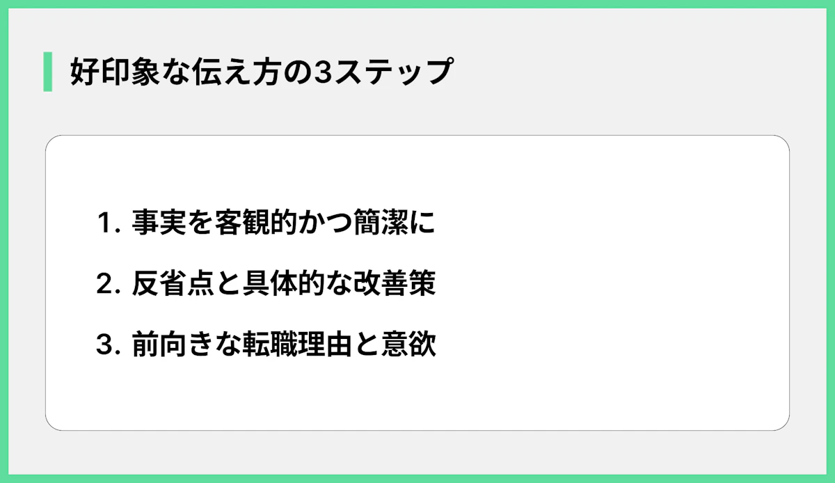短期離職の経験を伝える際には、伝え方次第で企業に与える印象が大きく変わります。どのように伝えれば、マイナスイメージを払拭し、むしろ好印象に繋げることができるのでしょうか。具体的な伝え方のコツは以下の通りです。詳しく見ていきましょう。