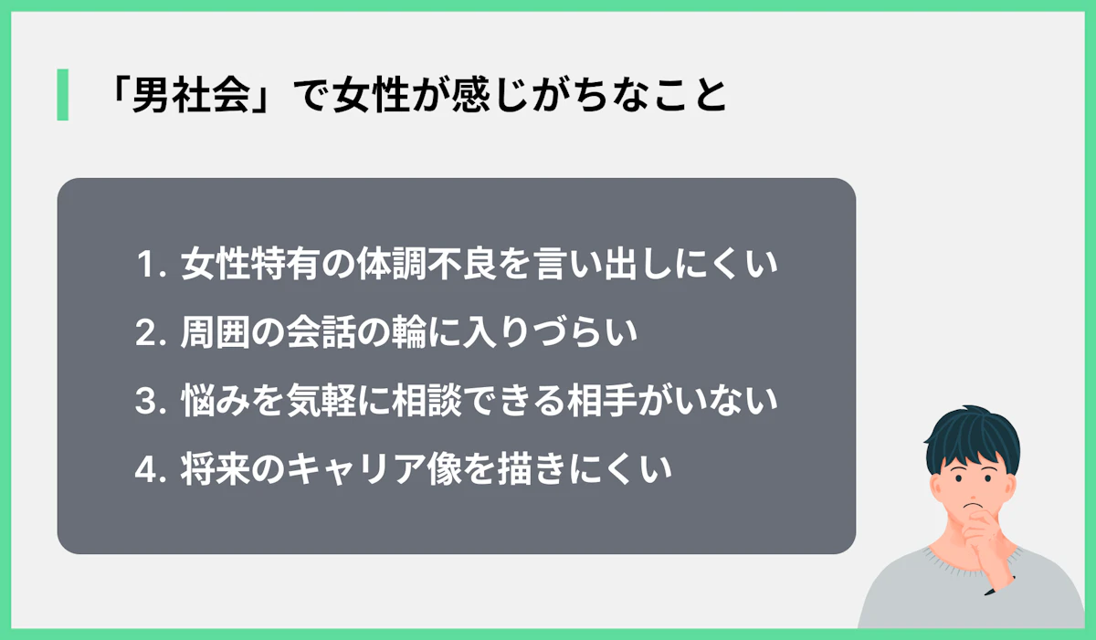 同期に女性が自分一人しかいない環境では、特有の悩みを感じることがあります。具体的には、以下の4つのような悩みが挙げられます。