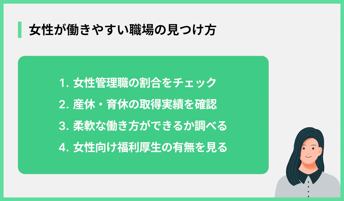 転職活動をする際は、女性社員が多く活躍している会社を意識して探してみましょう。求人情報で女性の管理職がいるか、産休・育休の取得実績が豊富かなどをチェックするのがおすすめです。また、会社のホームページやSNSで、女性社員が生き生きと働いている様子が紹介されているかも判断材料になります。実際に女性が働きやすい環境が整っている会社なら、入社後も安心してキャリアを築いていけるでしょう。