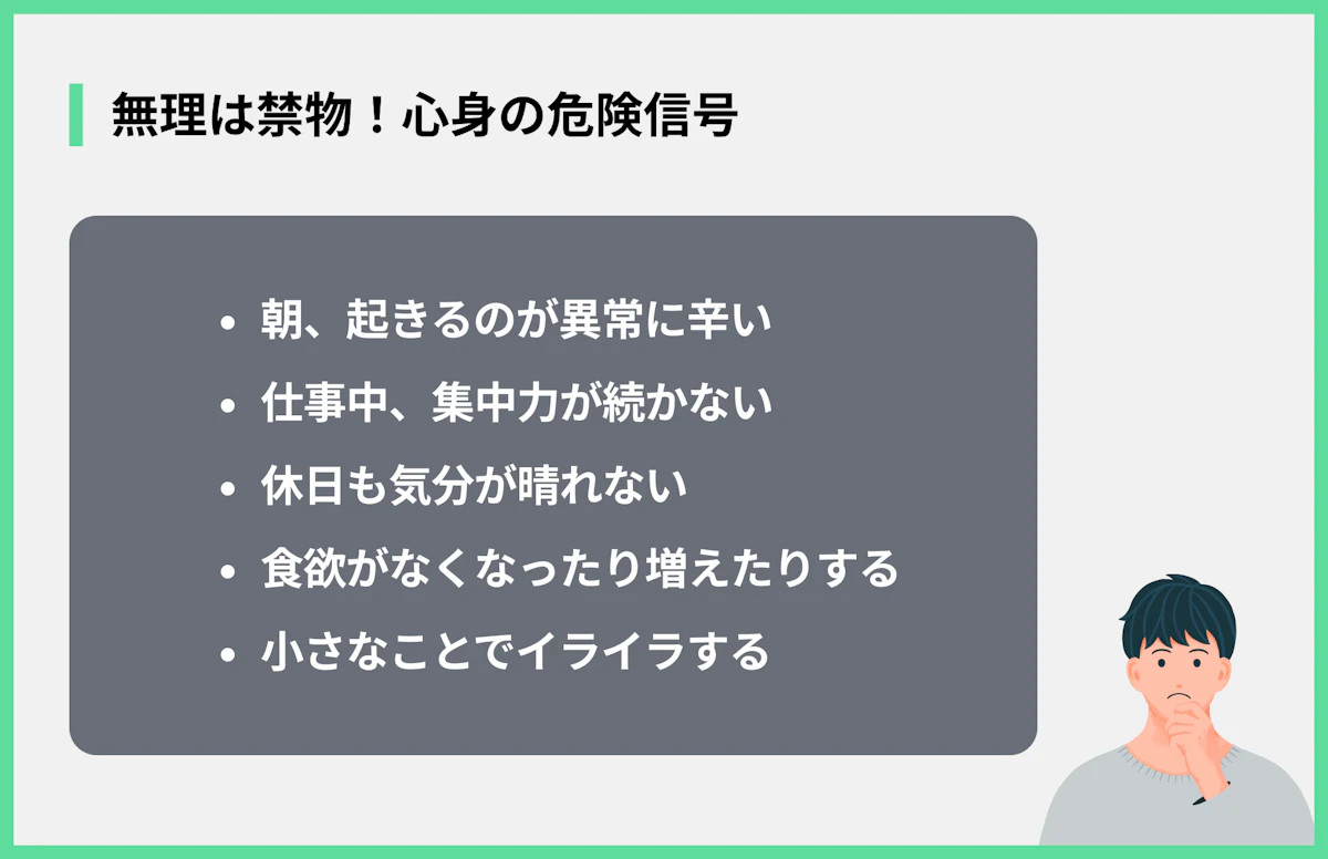 何よりも大切なのは、自身の健康です。寝つきが悪い、食欲がない、頭痛や腹痛が続くといった体の不調や、理由もなく不安になったり、気分が落ち込んだりする心の不調は、限界が近いサインです。こうしたサインを無視して働き続けると、回復に時間がかかってしまうこともあります。そうなる前に、勇気を出して環境を変える決断をすることが、自分自身を守ることに繋がります。