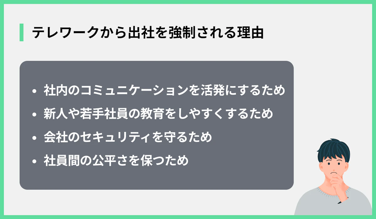 これまで快適だったテレワークから、急に出社を強制されると「どうして?」と疑問に思いますよね。会社側にも、出社を求めるいくつかの理由があります。具体的には以下の通りです。
