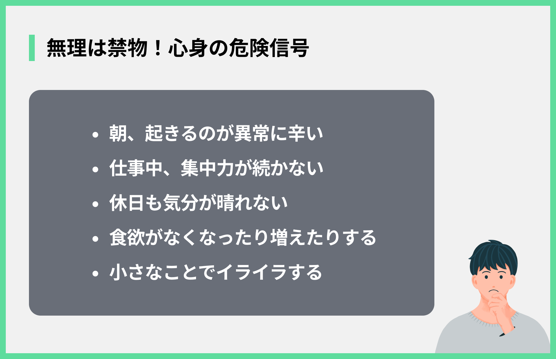 何よりも大切なのは、自身の健康です。寝つきが悪い、食欲がない、頭痛や腹痛が続くといった体の不調や、理由もなく不安になったり、気分が落ち込んだりする心の不調は、限界が近いサインです。こうしたサインを無視して働き続けると、回復に時間がかかってしまうこともあります。そうなる前に、勇気を出して環境を変える決断をすることが、自分自身を守ることに繋がります。