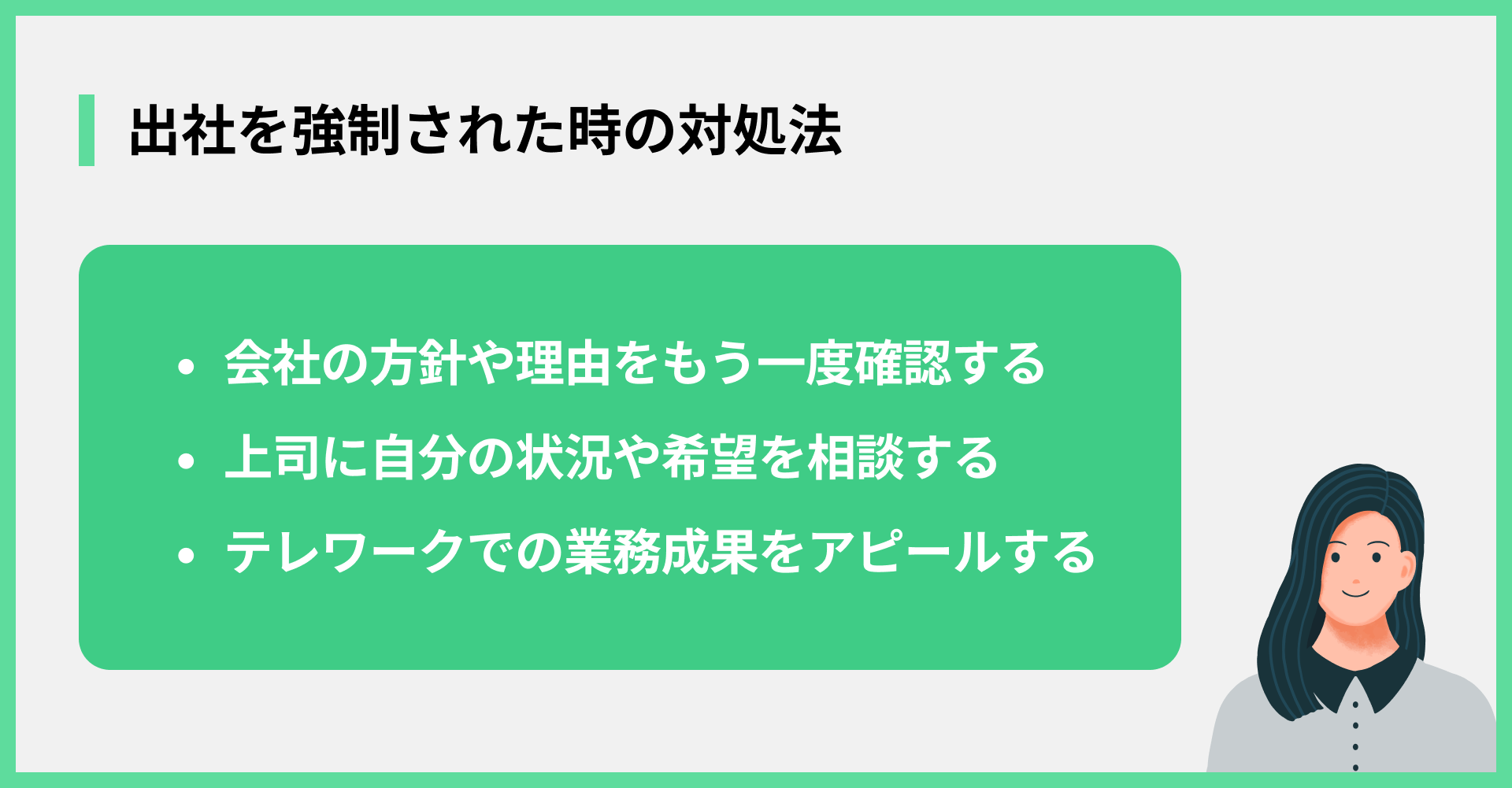 まずは、会社の方針を正しく理解することが大切です。なぜ出社が必要なのか、会社からの説明をもう一度よく確認してみましょう。感情的に反発するのではなく、「なるほど、そういう理由があるのか」と一度受け止めてみることで、冷静に次の手を考えられるようになります。会社の方針の背景を理解することで、ただ「嫌だ」と感じるだけでなく、自分なりにどう折り合いをつけるか、またはどう交渉するかのヒントが見つかるかもしれません。
