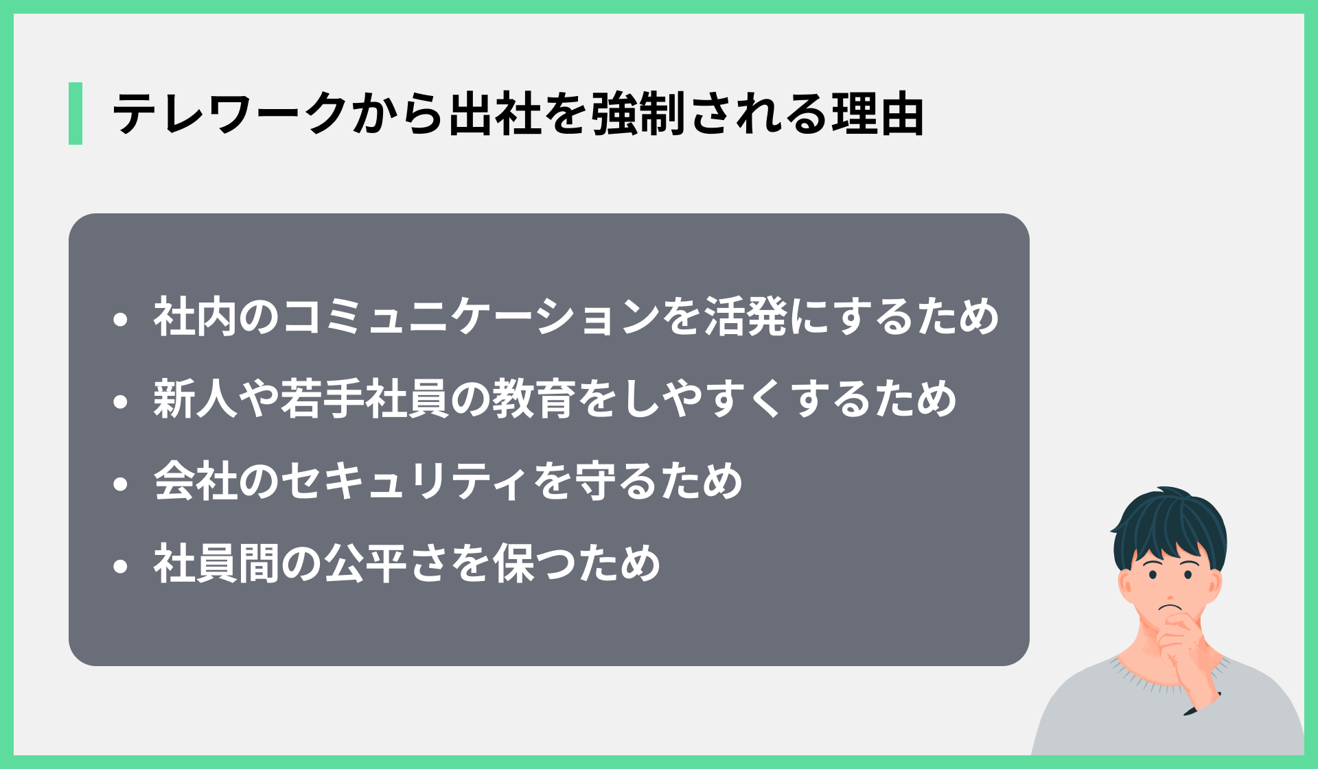 これまで快適だったテレワークから、急に出社を強制されると「どうして?」と疑問に思いますよね。会社側にも、出社を求めるいくつかの理由があります。具体的には以下の通りです。