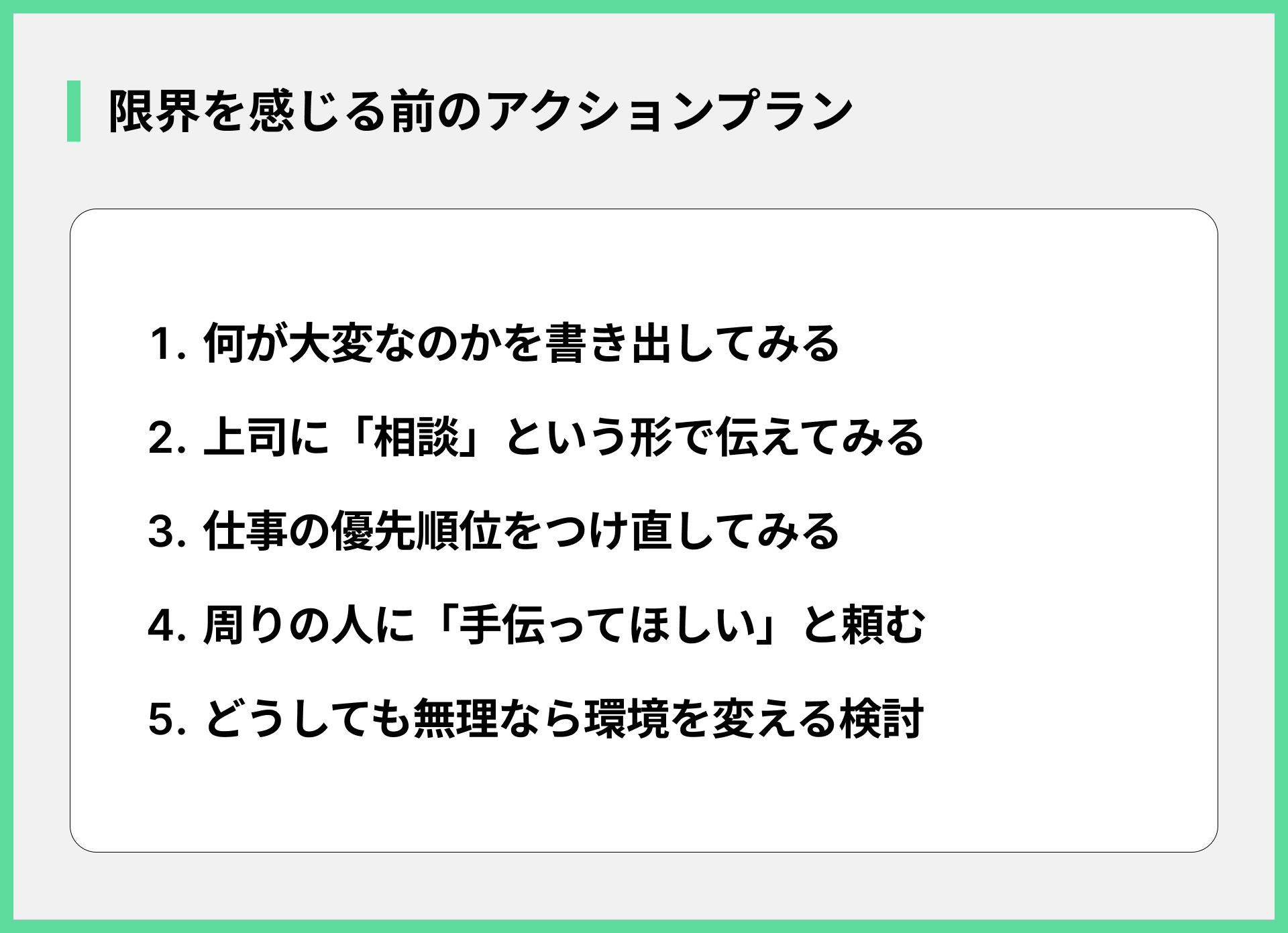 一人で抱え込まず、周りを巻き込みながら解決策を探していくことが大切です。各項目について、詳しく見ていきましょう。