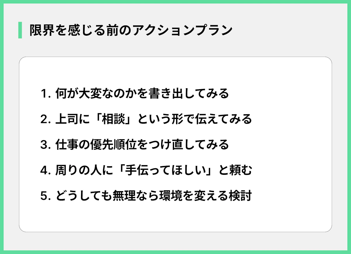 メリットや会社の意図は理解できても、「それでもやっぱり辛い」と感じるなら、我慢し続ける必要はありません。具体的な行動を起こして、状況を改善しましょう。対処法としては以下の方法が考えられます。