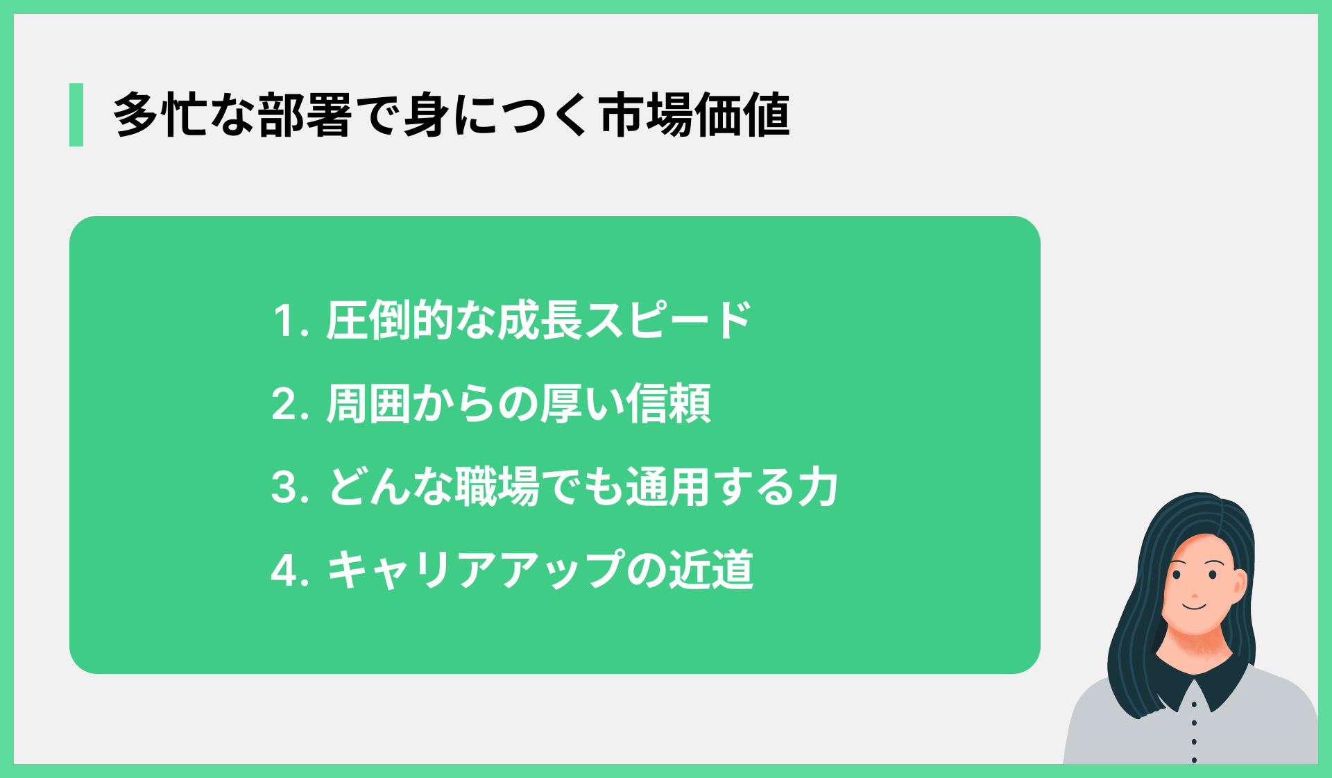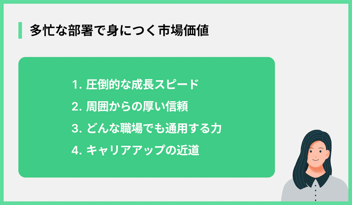 忙しい部署に配属されることは、大変なことばかりではありません。実は、将来のキャリアにとってプラスになる側面も多くあります。メリットに関するポイントは以下の通りです。