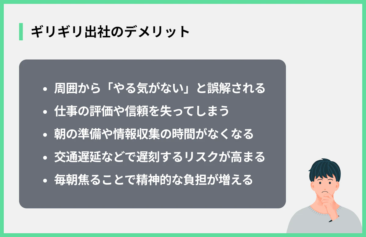 ギリギリの出社は、たとえ遅刻していなくても、自分では気づかないうちに多くのデメリットを生んでいます。具体的には以下の通りです。