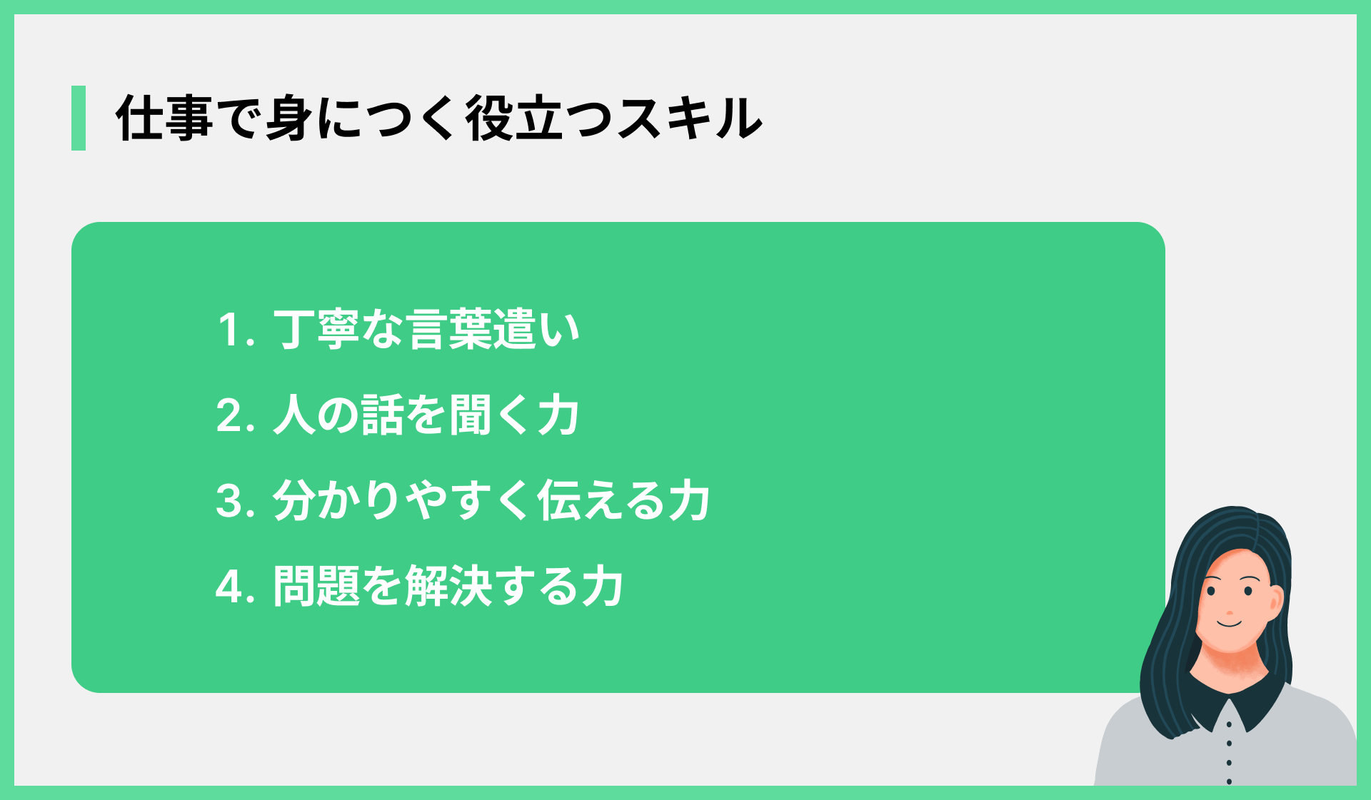 カスタマーサポートの仕事を通して、どんな仕事にも活かせるスキルが身につきます。顧客が何に困っているのかを正確に聞き出す「傾聴力」、分かりやすく物事を伝える「説明力」、そして冷静に対応する「問題解決能力」などが日々磨かれていきます。これらのスキルは「ポータブルスキル」とも呼ばれ、将来的に別の職種に転職する際にも大きな武器になります。人と接する仕事である限り、ここで培った経験は決して無駄にはなりません。