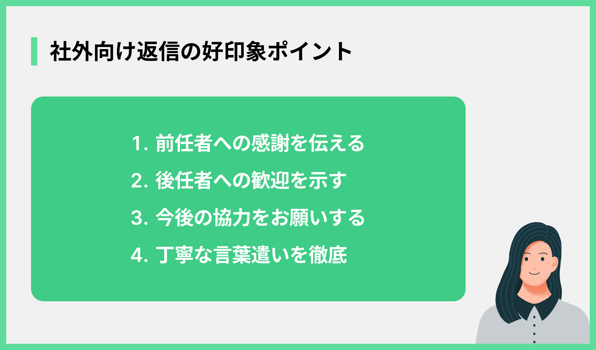 後任の担当者から単独で挨拶メールが来た場合は、今後の協力関係を築いていきたいという前向きな姿勢を示すことが大切です。温かく歓迎する気持ちを伝えましょう。