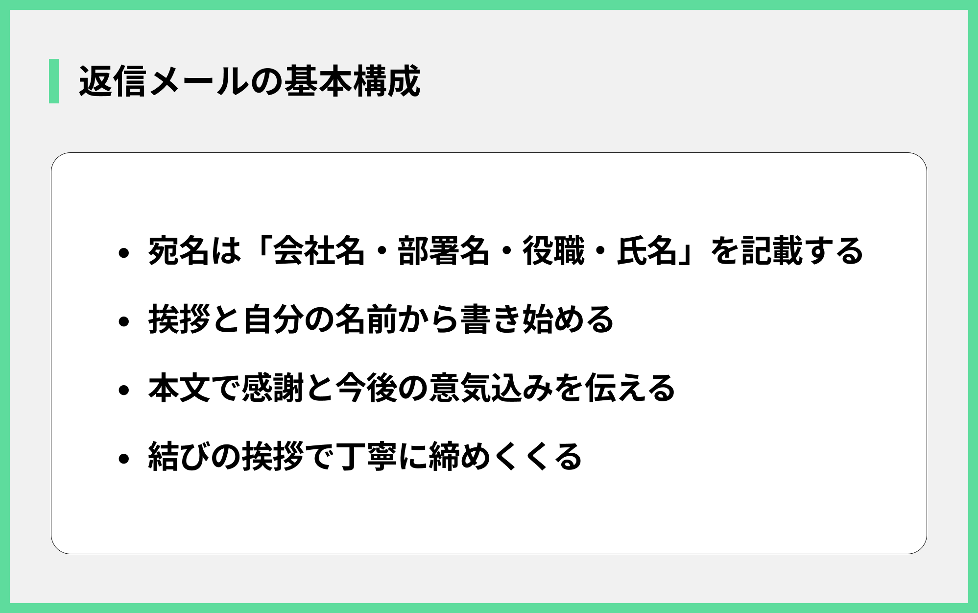 配属挨拶メールへの返信は、決まった型に沿って書けば、決して難しいものではありません。ここでは、返信メールを構成する基本的な要素を4つのステップに分けて解説します。以下の流れを意識すれば、誰でも失礼のない丁寧なメールを作成できます。