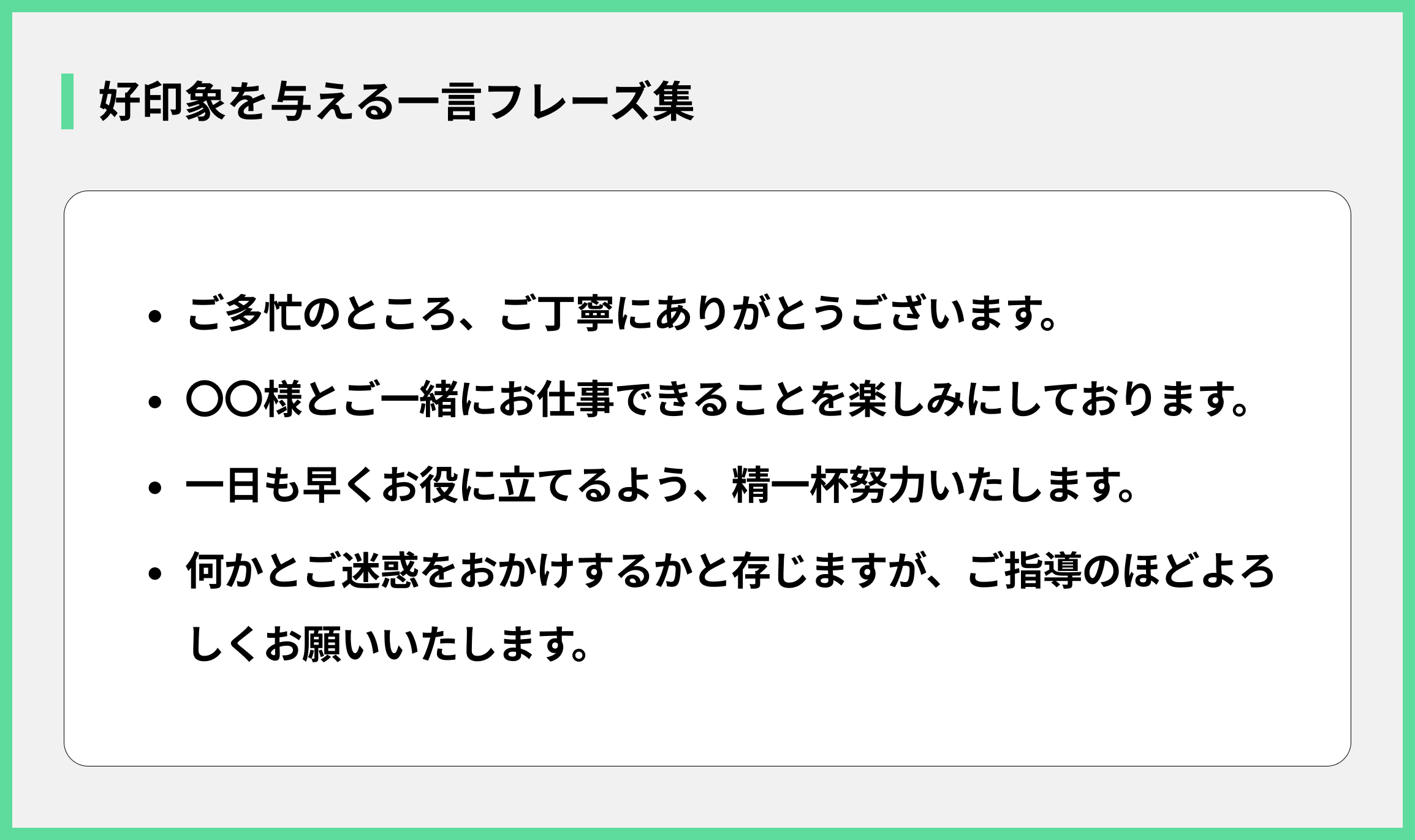 メールの文面には、できるだけ前向きで明るい言葉を選ぶことを意識しましょう。同じ「頑張ります」という気持ちを伝えるにしても、「ご期待に添えるよう頑張ります」よりも「ご期待に応えられるよう、精一杯取り組みます」の方が、より積極的で頼もしい印象を与えます。「未経験で不安ですが」と書くよりも、「未経験の分野で学ぶことが多く、とても楽しみです」と表現を変えるだけで、相手の受け取り方は大きく変わります。自分のやる気や前向きな姿勢を伝えることで、相手も「一緒に働くのが楽しみだ」と感じてくれるはずです。