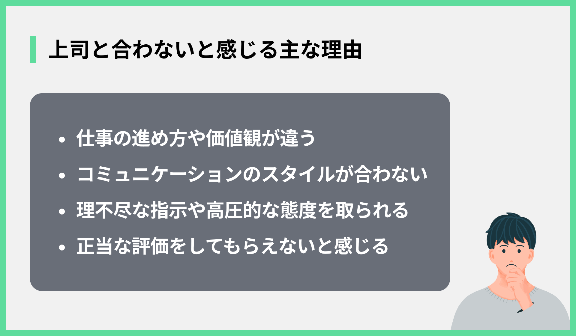 「上司と合わない」と一言でいっても、その理由はさまざまです。ここでは、よくある理由を以下の通り紹介します。自分はどのケースに当てはまるか、考えてみましょう。