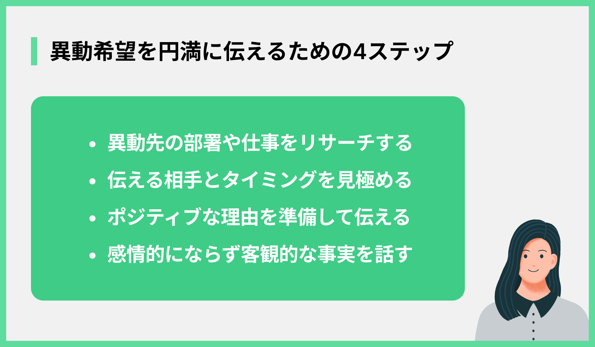 異動したいという気持ちが固まったら、次は行動に移す番です。ですが、伝え方を間違えると、話がこじれてしまう可能性もあります。円満に異動するための具体的なステップを、以下の通り紹介します。