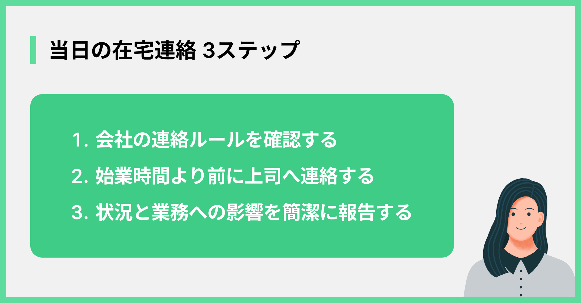 在宅勤務に切り替えたいと決めたら、始業時間の10〜15分前までには連絡するのが理想です。わかった時点ですぐに連絡を入れることで、上司や同僚も一日の業務の段取りを考えやすくなります。「ギリギリの連絡になってしまった…」という状況は、できるだけ避けましょう。早めの連絡は、仕事に対する責任感の表れでもあります。