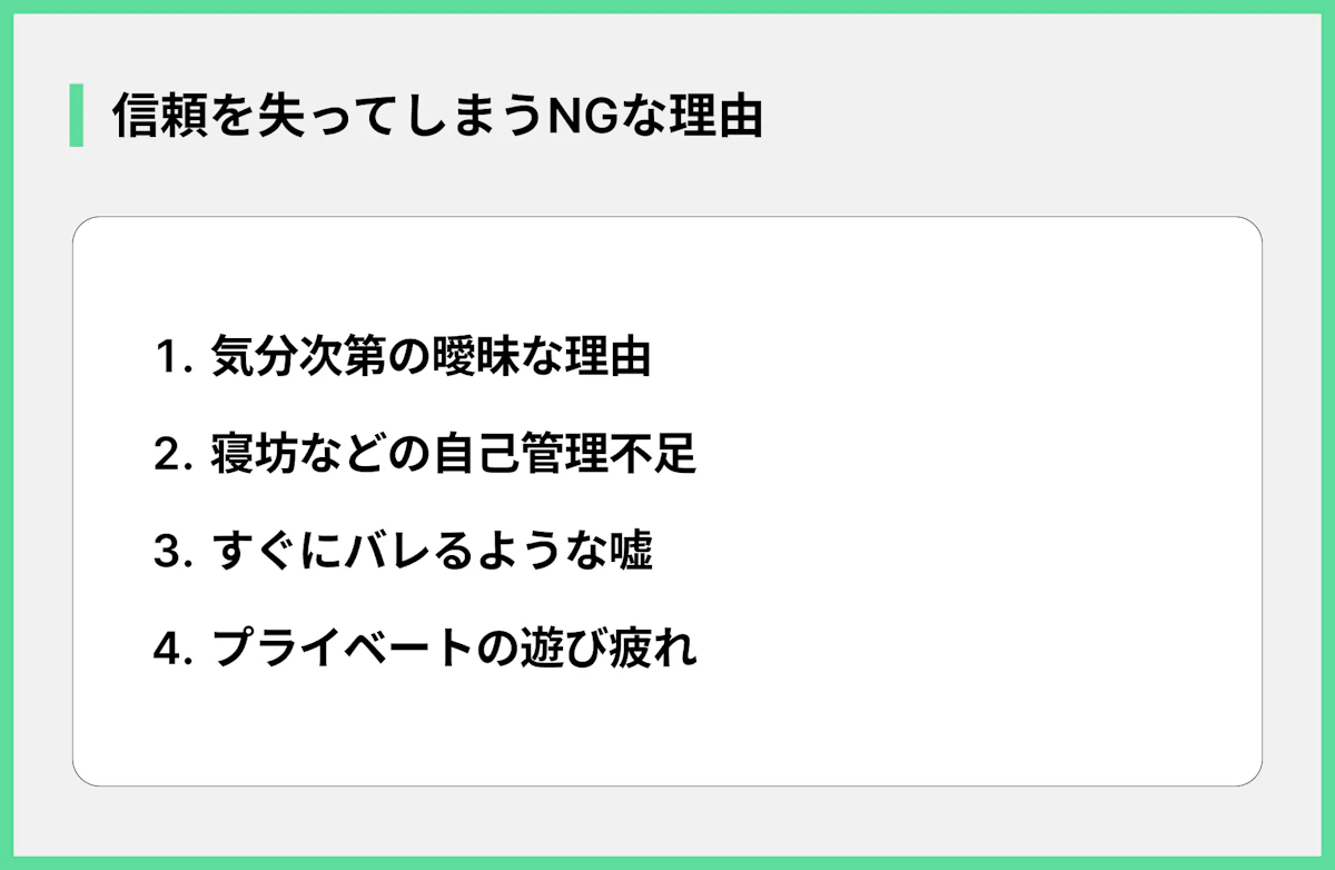 「遠方に住む祖母が危篤で…」といった、後からつじつまが合わなくなるような嘘は絶対にやめましょう。嘘は、いつかバレるものです。ふとした同僚との会話やSNSの投稿など、思わぬところから発覚するケースは少なくありません。一度失った信用を取り戻すのは非常に困難です。正直に伝えるのが一番安全な道です。