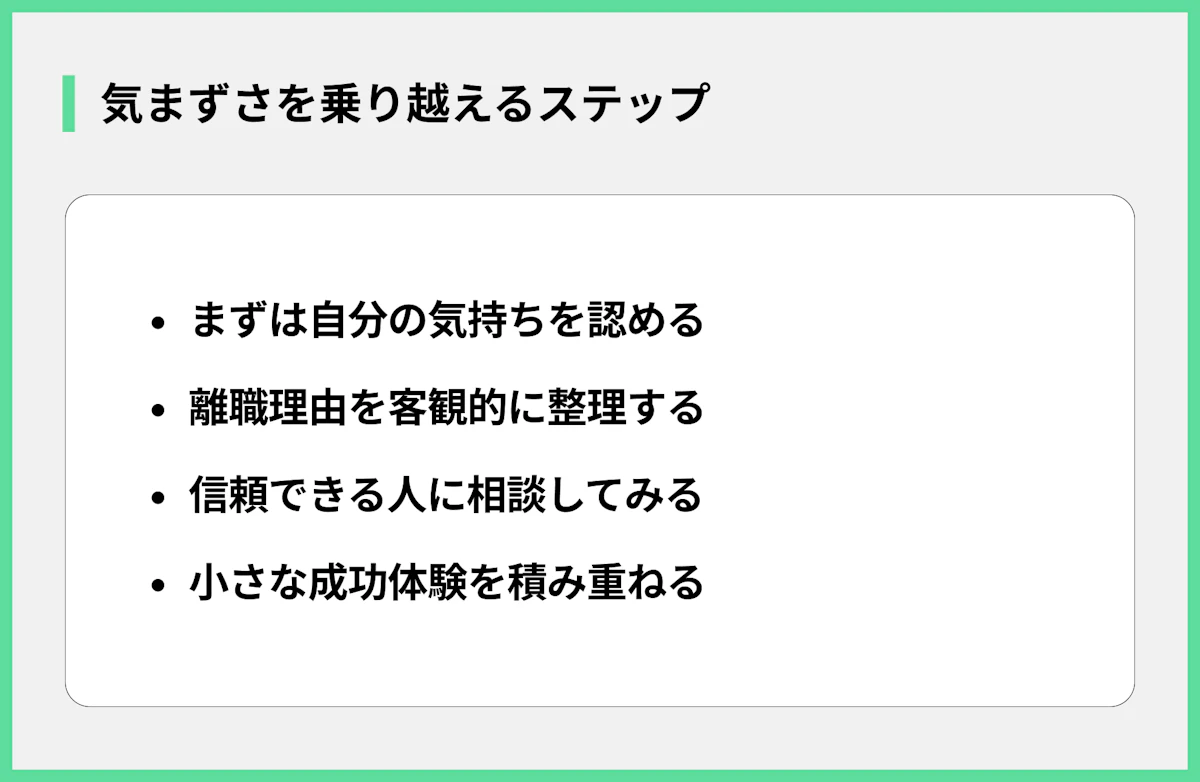 短期離職で気まずい気持ちを抱えてしまうのは、誰にでも起こりうることです。大切なのは、その気持ちとどう向き合い、どう乗り越えていくかです。ここでは、気まずさを乗り越えるための具体的なステップについて、以下の通り解説します。