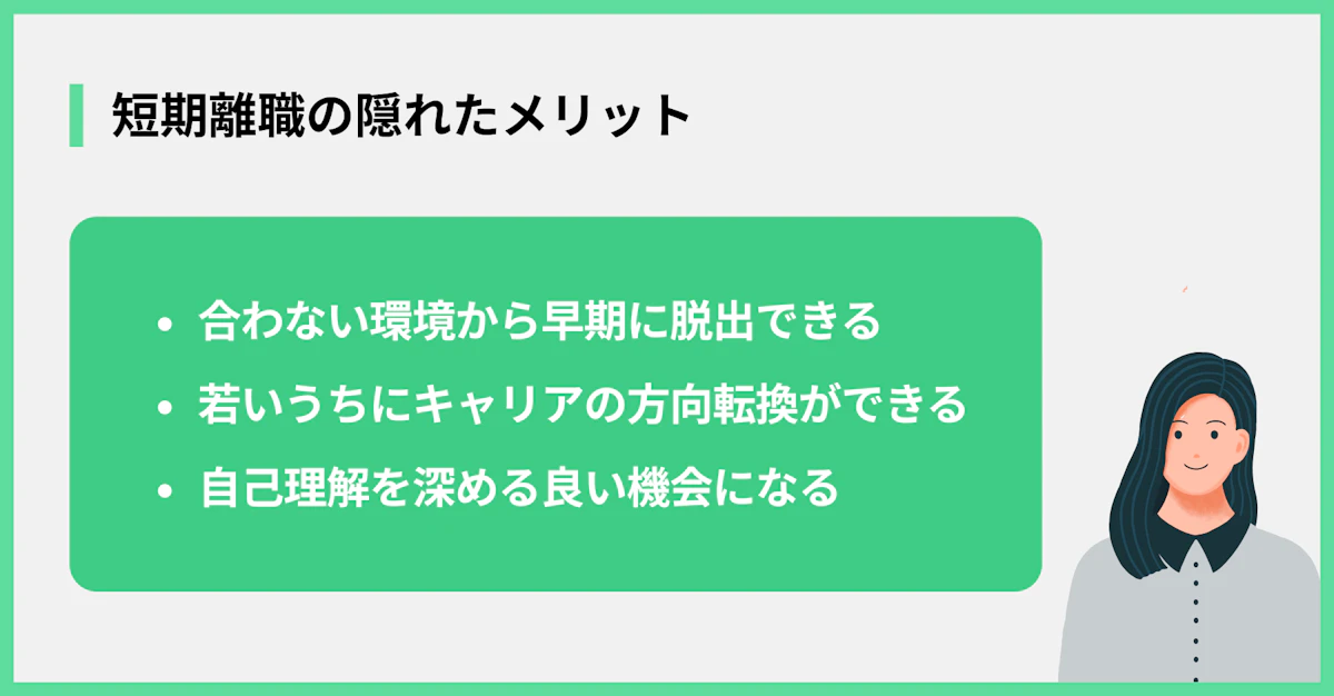 「短期で辞めちゃったけど、何か良いことなんてあるのかな…」と不安に思うかもしれません。ですが、見方を変えれば、短期離職の経験にもプラスの側面があります。ここでは、短期離職のメリットについて、以下の通り考えてみましょう。