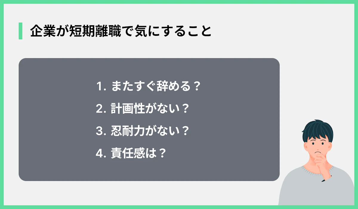 企業が短期離職の経歴を持つ応募者に対して懸念するのは、「またすぐに辞めてしまうのではないか」「うちの会社で長く続けてくれるだろうか」という点です。採用にはコストも時間もかかりますから、早期離職のリスクを避けたいと考えるのは自然なことです。また、「仕事に対する我慢が足りないのでは」「計画性がないのでは」といった印象を持たれてしまう可能性も考えておく必要があります。