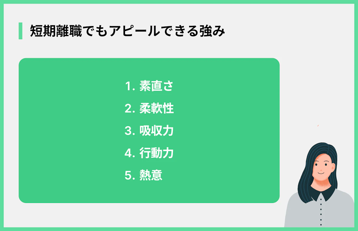 短期離職でもアピールできることに関するポイントは以下の通りです。