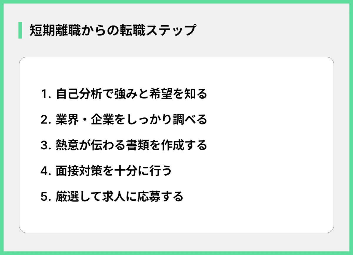 短期離職からの転職活動の具体的な進め方に関するポイントは以下の通りです。