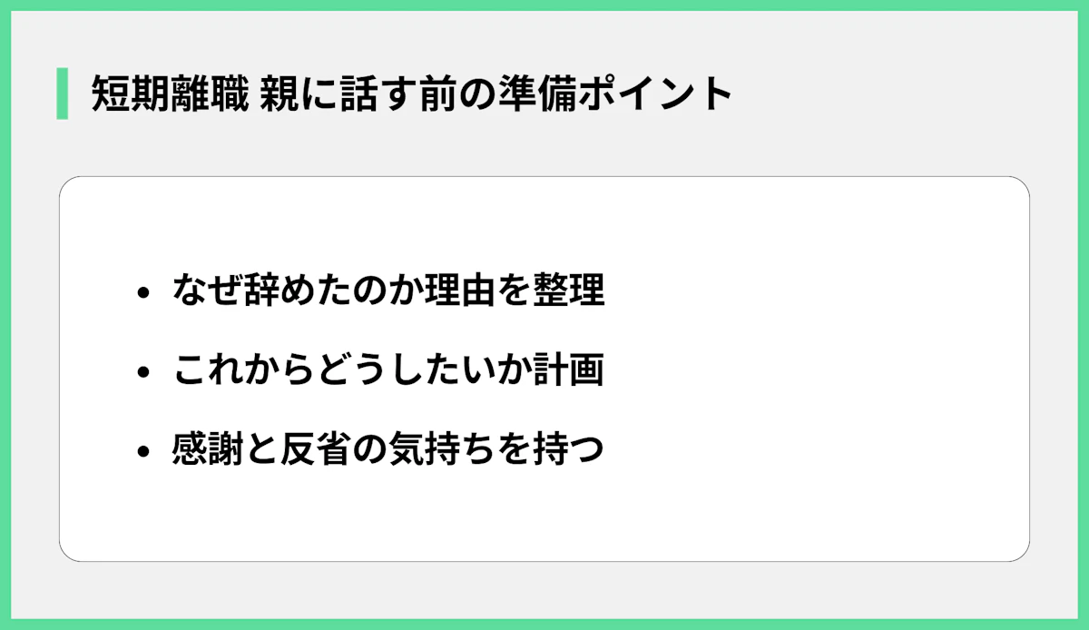 また、短期離職という結果になってしまったこと、心配をかけてしまうことに対して、素直に申し訳ないという気持ちを伝えることも、誠実な態度として親に受け入れられやすくなるでしょう。