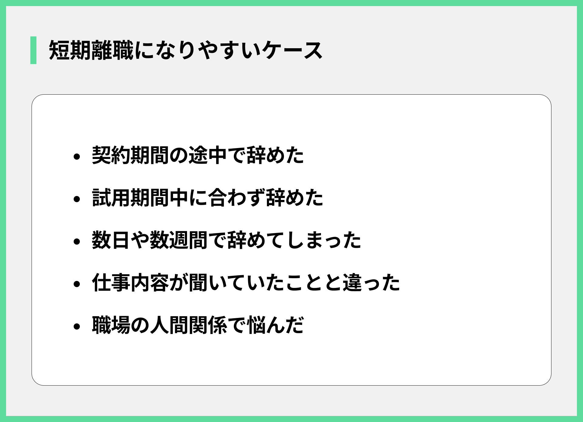 「短期離職」という言葉を聞くと、少しネガティブなイメージを持つかもしれません。では、派遣で働く場合、具体的にどのような状況が「短期離職」と呼ばれるのでしょうか。派遣での短期離職の具体的なケースは以下の通りです。