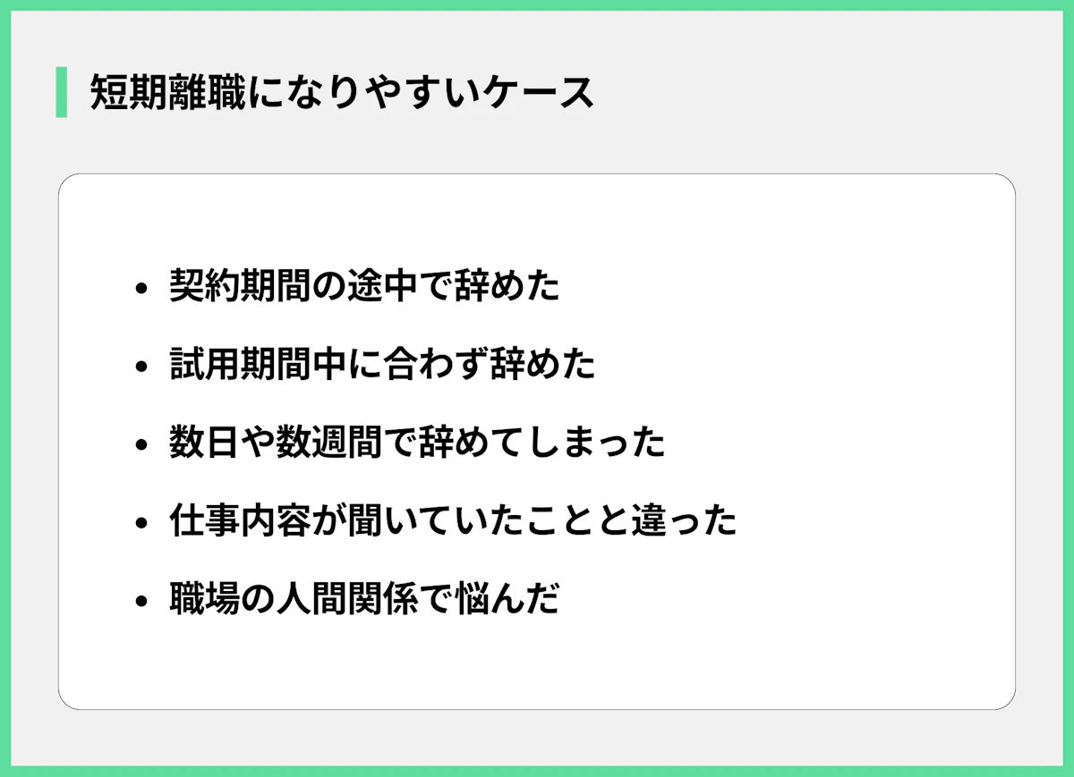 契約期間や試用期間に関わらず、働き始めてから本当に短い期間、例えばほんの数日や数週間で仕事を辞めてしまうケースも、短期離職に該当します。