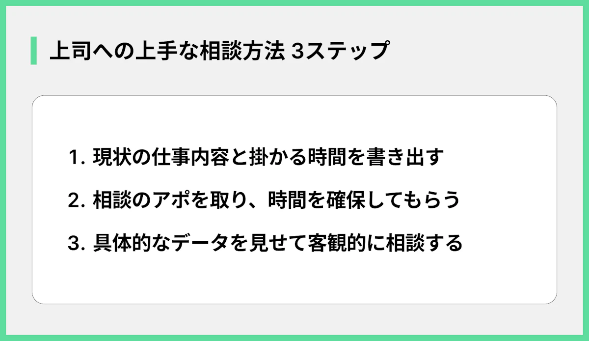 まずは、現状を正直に伝えることから始めましょう。「どの業務にどれくらいの時間がかかっているか」を自分で把握し、それを基に上司に相談することが重要です。ただ「仕事が多くて終わりません」と伝えるのではなく、「〇〇の作業に△時間かかっており、今の業務量では定時までに終えるのが難しいです」と具体的に話すことで、上司も状況を理解しやすくなり、業務量の調整を検討してくれる可能性が高まります。