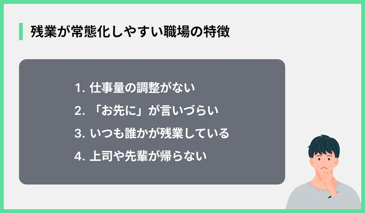 職場によっては、時短勤務への理解が十分でない場合があります。その結果、勤務終了時間間際に「これお願い」と仕事を頼まれたり、「少しだけなら手伝ってくれるだろう」と気軽に頼まれごとをされたりして、断りづらい雰囲気になってしまうことがあります。「時短勤務だから」と遠慮してしまい、はっきりと断れないままでいると、それが当たり前になってしまい、残業が常態化する原因になります。