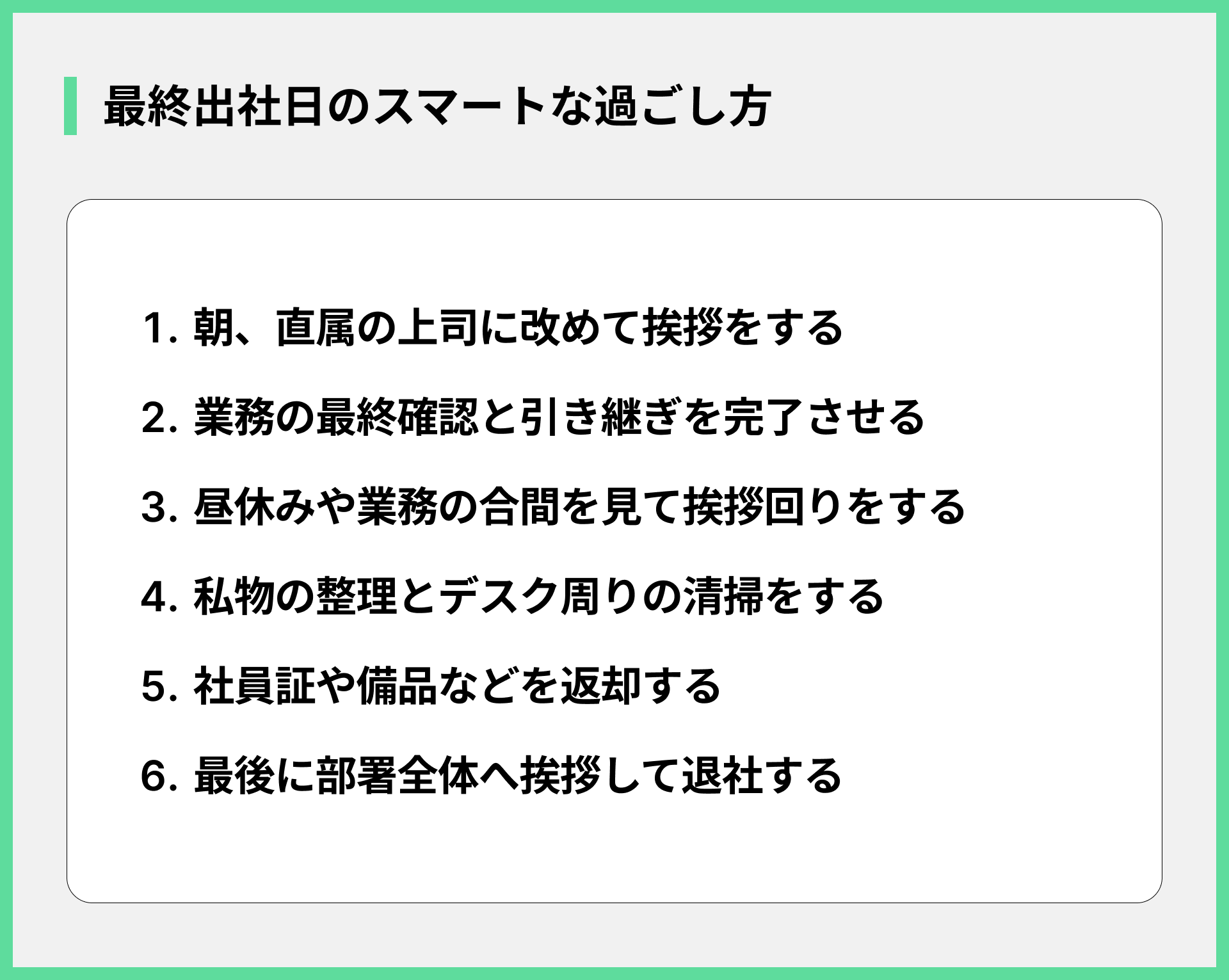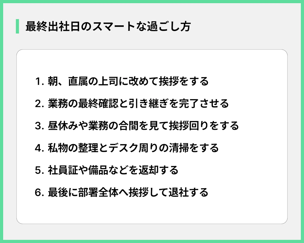 もし、朝礼や夕礼などで、最後に挨拶する機会をもらえるのであれば、そこが最大のチャンスです。公の場で改めて感謝を述べることで、職場全体に対して誠実な印象を与えることができます。何を話せばいいか分からない場合は、事前に簡単なメモを用意しておくと安心です。内容は、在籍期間中の感謝、仕事を通して学んだこと、そして今後の抱負などを簡潔にまとめると良いでしょう。ネガティブな退職理由だったとしても、会社の悪口や不満を言うのは絶対にNGです。あくまでも、前向きな言葉で締めくくるのがマナーです。