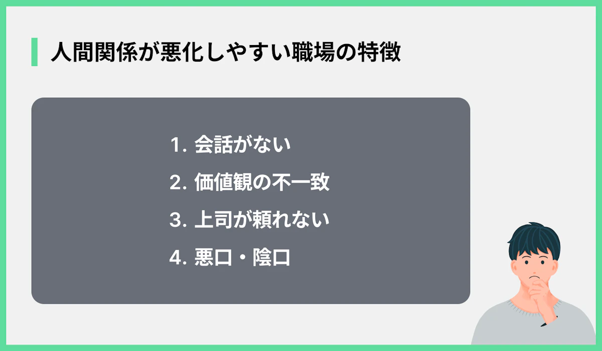 なぜか人間関係に恵まれないと感じるなら、それはあなた個人の問題ではなく、職場環境そのものに原因があるのかもしれません。人間関係が悪化しやすい職場には、いくつかの共通した特徴があります。