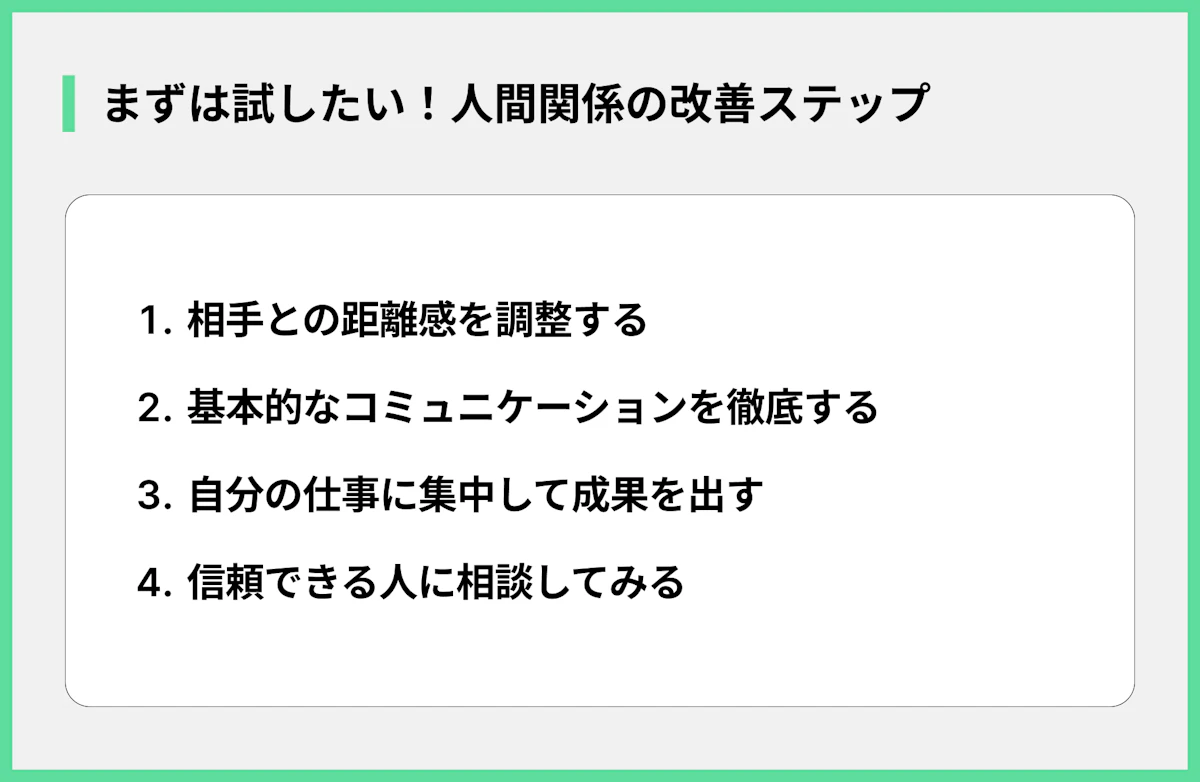 すぐに転職するのは難しいと感じる人もいるでしょう。そんなときは、まず今の職場でできることから試してみるのも一つの手です。少しの工夫で、状況が好転する可能性もあります。