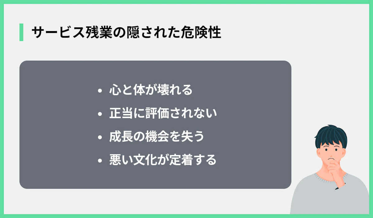 「周りに合わせないと」「頑張りを見せたい」といった気持ちから、ついサービス残業をしてしまうことはありませんか?ここでは、若手社員がサービス残業に陥りやすい心理的な背景と、その状況が当たり前になってしまう危険性について解説します。具体的には以下の項目について解説します。