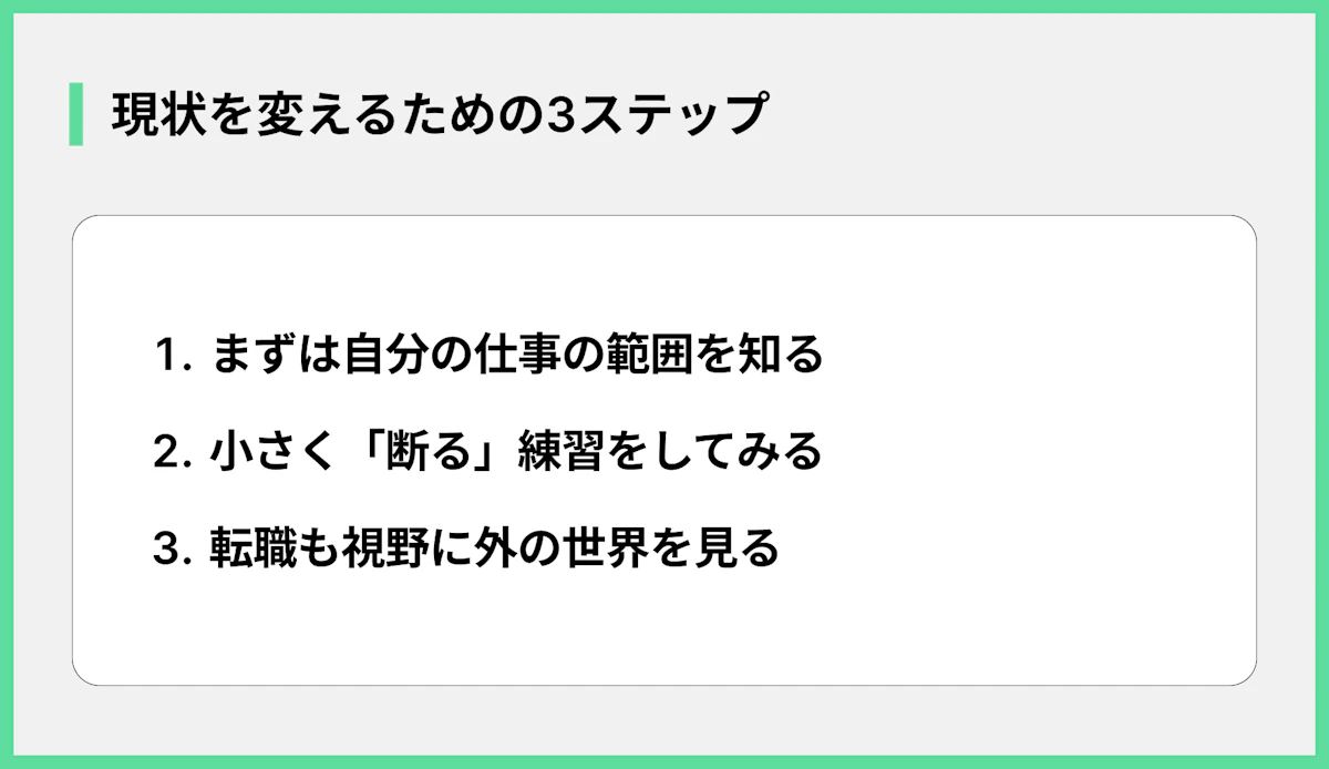 今の状況を変えたいと思っていても、具体的に何から始めればいいか分からず、立ち止まってしまうかもしれません。ここでは、サービス残業の文化から抜け出し、自分らしい働き方を取り戻すための具体的なステップを解説します。現状を打破するための方法は、以下の通りです。