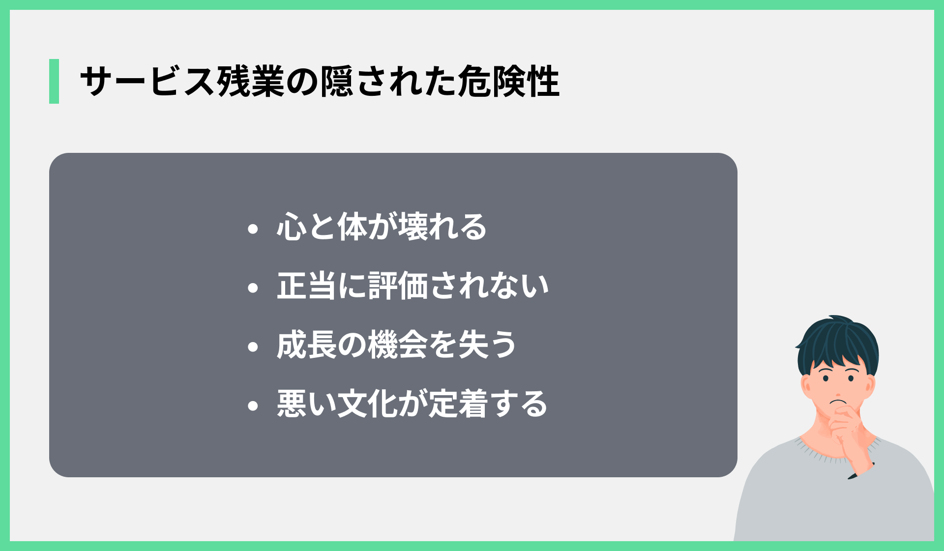 「周りに合わせないと」「頑張りを見せたい」といった気持ちから、ついサービス残業をしてしまうことはありませんか?ここでは、若手社員がサービス残業に陥りやすい心理的な背景と、その状況が当たり前になってしまう危険性について解説します。具体的には以下の項目について解説します。