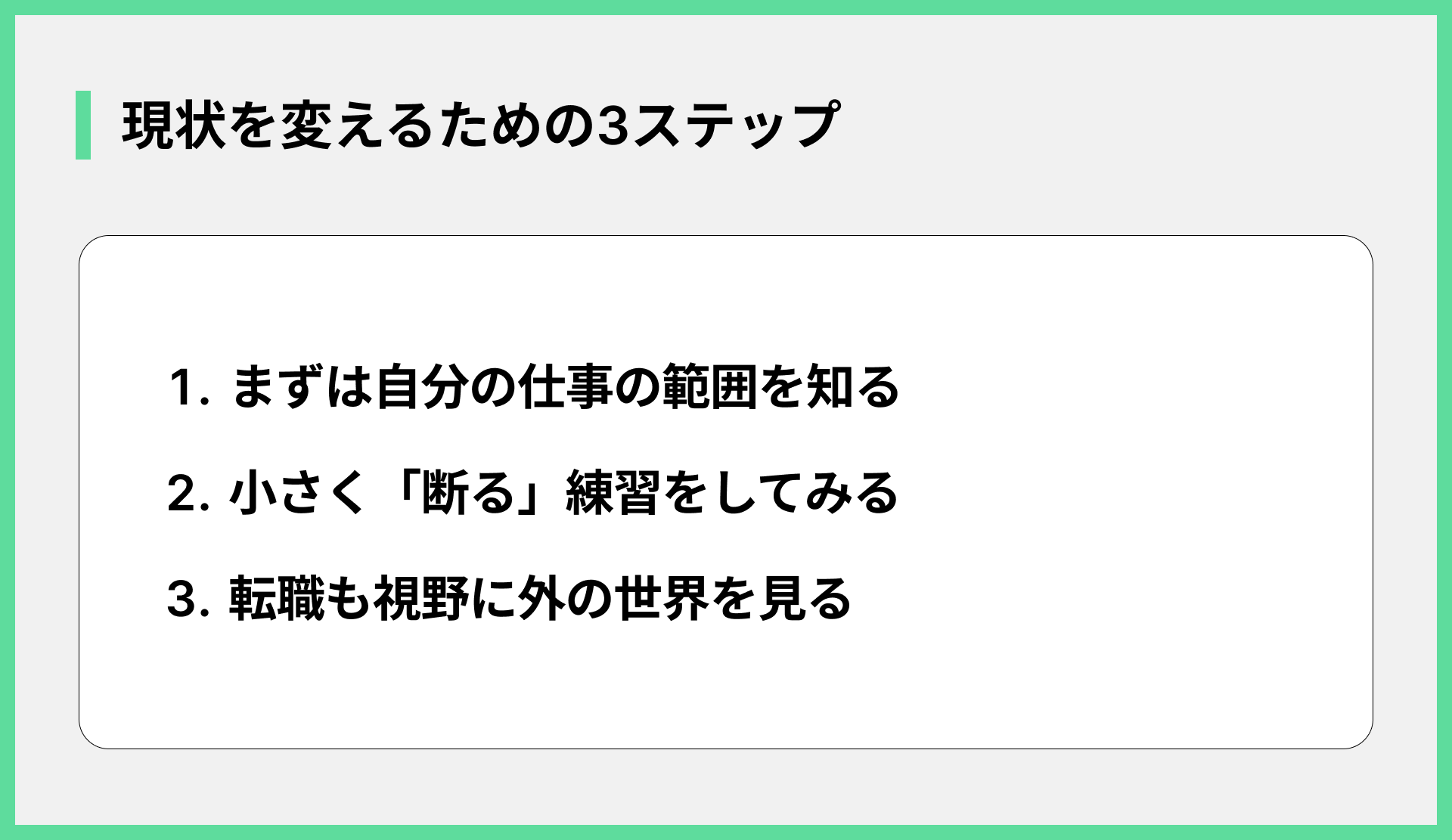 今の状況を変えたいと思っていても、具体的に何から始めればいいか分からず、立ち止まってしまうかもしれません。ここでは、サービス残業の文化から抜け出し、自分らしい働き方を取り戻すための具体的なステップを解説します。現状を打破するための方法は、以下の通りです。