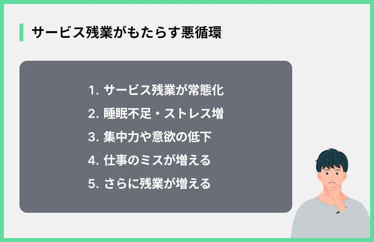 「みんなやっているから」「断りづらいから」といった理由でサービス残業を続けていると、長期的には様々なデメリットが生じます。具体的には、以下の通りです。