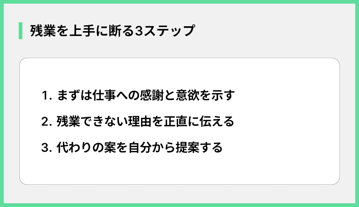 断るのが苦手な場合は、「この日は残業できません」と先に伝えておくのが有効です。「今日は通院の予定があって」「家族との約束があって」など、具体的な理由を添えると、相手も無理強いしにくくなります。毎週特定の曜日を「ノー残業デー」と自分で決めて、それを周囲に伝えておくのも良い方法です。残業しない日を意識的に作ることで、心と体をリフレッシュする時間を作ることができます。