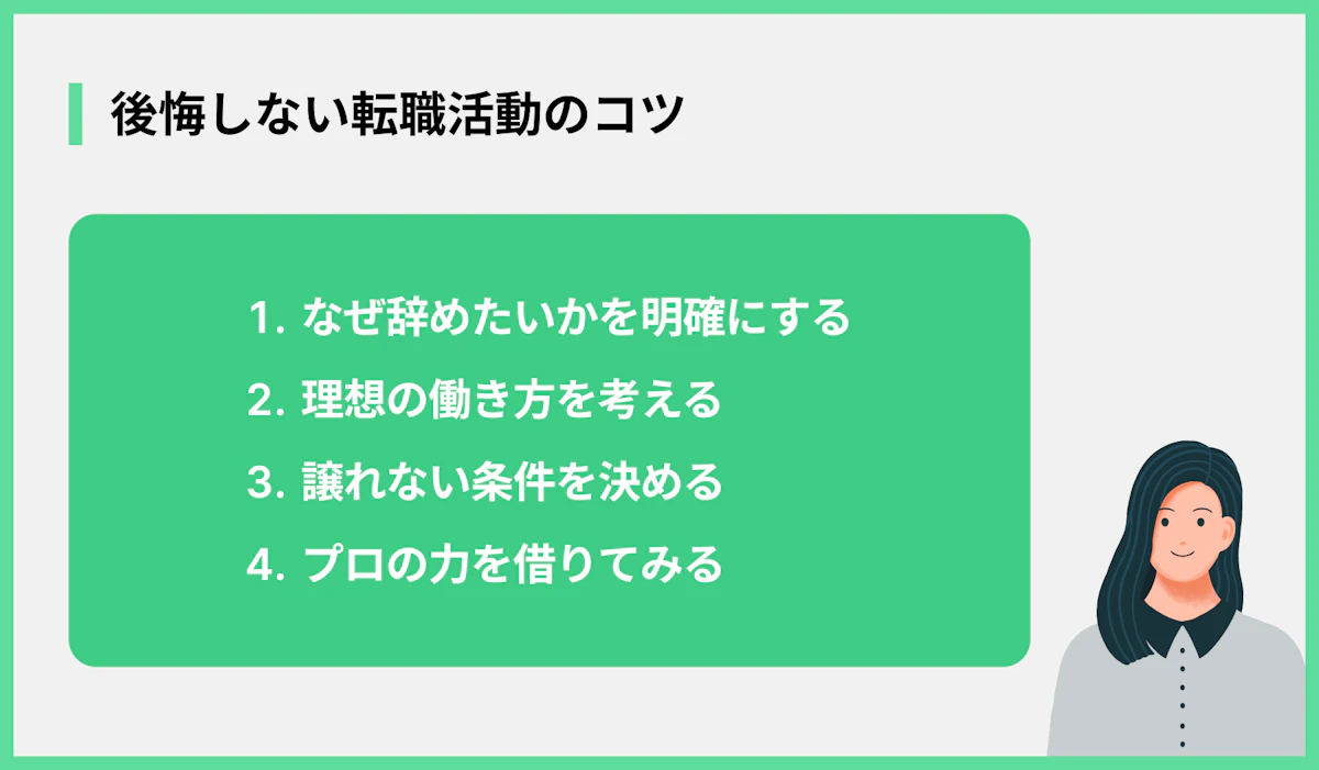 せっかく転職するなら、「前の会社の方が良かった…」と後悔はしたくないものです。転職を成功させるためには、いくつか押さえておきたいポイントがあります。具体的には、以下の通りです。