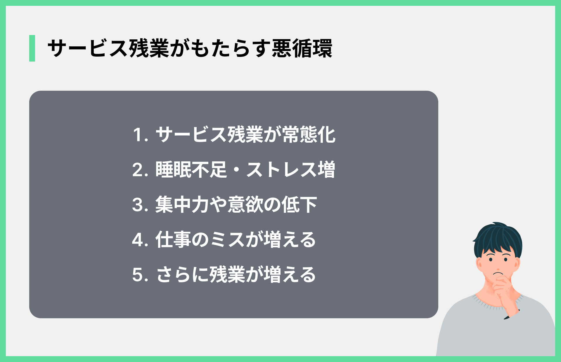 「みんなやっているから」「断りづらいから」といった理由でサービス残業を続けていると、長期的には様々なデメリットが生じます。具体的には、以下の通りです。