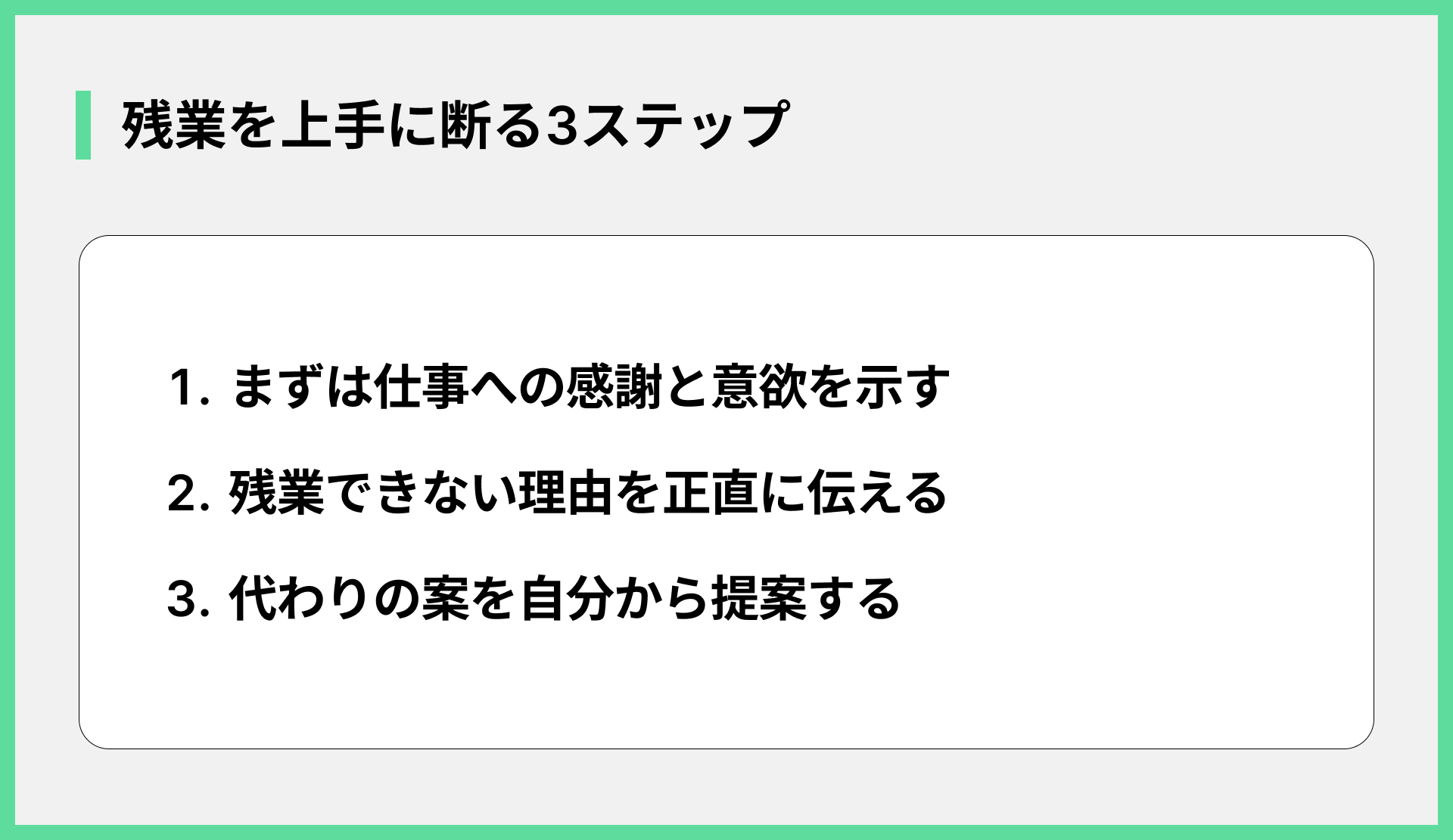 断るのが苦手な場合は、「この日は残業できません」と先に伝えておくのが有効です。「今日は通院の予定があって」「家族との約束があって」など、具体的な理由を添えると、相手も無理強いしにくくなります。毎週特定の曜日を「ノー残業デー」と自分で決めて、それを周囲に伝えておくのも良い方法です。残業しない日を意識的に作ることで、心と体をリフレッシュする時間を作ることができます。
