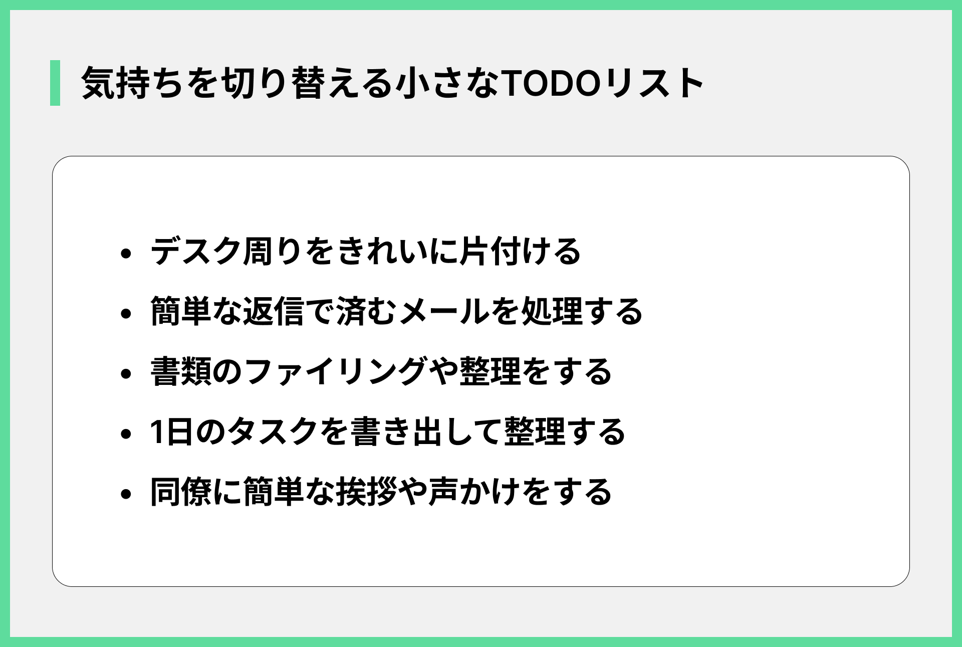 仕事に手がつかない時は、すぐに終わる簡単な作業から始めてみましょう。例えば、メールのチェックやデスク周りの整理、簡単なデータ入力など、頭を使わずにできるものがおすすめです。大きな仕事や難しい仕事のことを考えると、圧倒されて「やりたくない」という気持ちが強くなります。ですが、小さなタスクでも一つ完了させると、「自分はできた」というささやかな達成感が得られます。この達成感がエンジンの役割を果たし、徐々に仕事モードに切り替えていく助けになります。