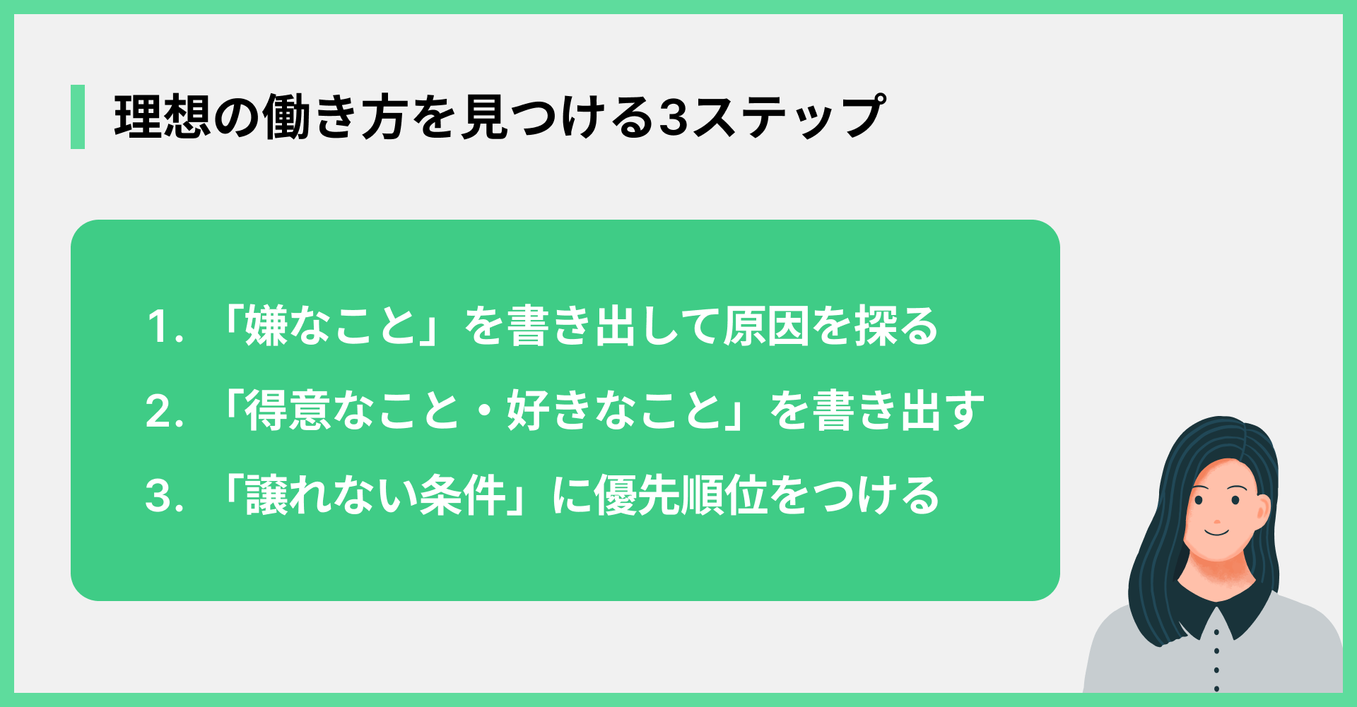 原因と自分の特性が見えてきたら、理想の働き方を具体的にイメージしてみましょう。給与、勤務地、休日、職場の雰囲気、仕事内容など、働く上で何を重視したいのか、優先順位をつけていきます。「給料はそこそこでいいから、残業がなくてプライベートを大切にしたい」「未経験でもスキルが身につく環境で成長したい」「とにかく人間関係の良い職場で働きたい」など、自分なりの「理想の働き方」の軸を明確にすることが大切です。この軸が、今後の仕事選びのブレない基準となります。