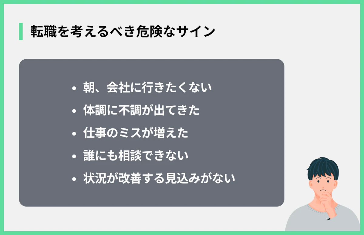いろいろ試しても状況が改善せず、辛い日々が続くなら、転職も大切な選択肢の一つです。我慢し続ける必要はありません。転職を考えるべきサインは以下の通りです。